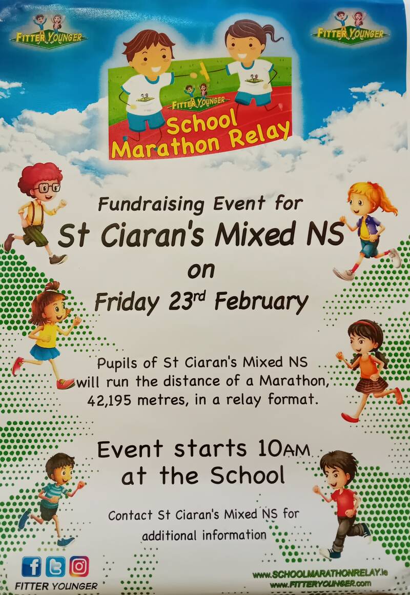 Thank you so much to everyone who donated and also to Ballycumber GAA who very kindly sponsored refreshments for every child for their participation in the marathon. Also a big thank you to Ciaran from Fitter Younger Ireland who helped us in the setting up of the Marathon.